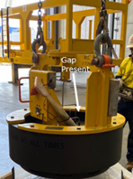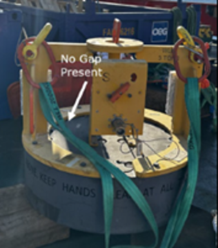At the time of the event, the rigger was holding the top section of the pressure cap collar to guide and land the cap onto grillage. As the inner section of the cap landed, the collar automatically lowered (as designed), trapping several of the rigger’s fingertips between the collar and the inner section. The crane operator was immediately instructed to raise the load, allowing the rigger’s fingers to be released. The rigger was evacuated to an onshore medical facility and underwent surgery on two fingertips.