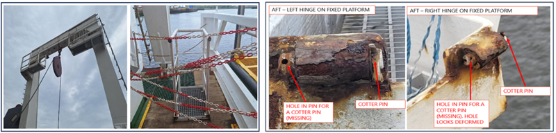It was observed by the investigation team that all parts of the platform hinges parts remained undamaged except the cotter pins which were missing. The conclusion drawn was that the only way the platform could have had fallen was because the foldable platform slid off the hinge pins (cotter pins to keep hinge pins in position were missing) when the crew member stepped on the platform.